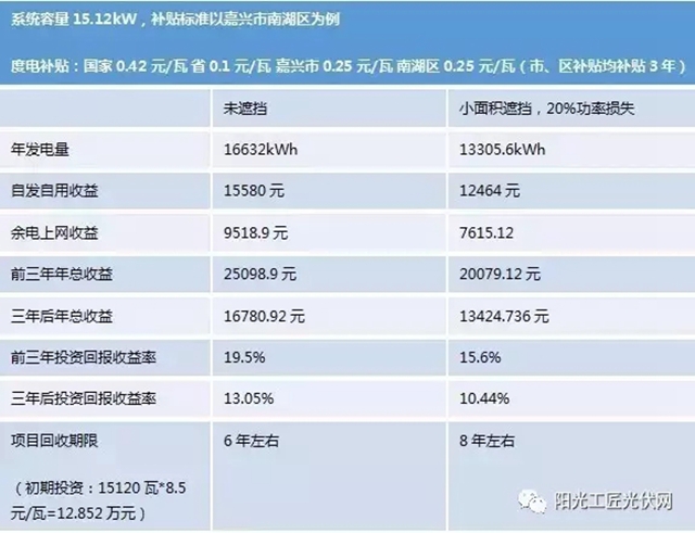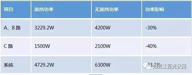 小小的陰影遮擋,給系統(tǒng)帶來了33.2%的功率損失。那么這對于投資收益的影響有多少呢?鑒于以上案例的實驗時間為當(dāng)年11月,且不同時間段的陰影遮擋面積不同,我們按照20%的功率損失進行計算: