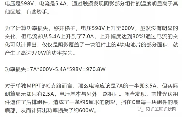 經(jīng)過勘探與計算得出該電站的功率因為兩處陰影導(dǎo)致?lián)p失高達1570W。除了功率損失之外,光伏系統(tǒng)中的陰影造成熱斑,長期如此,會加速組件老化,嚴(yán)重影響組件壽命。