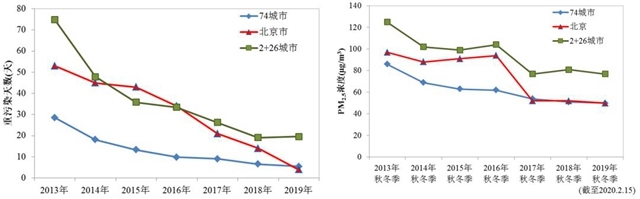 全國74城市、“2+26”城市和北京市重污染超標天和秋冬季PM2.5濃度的變化