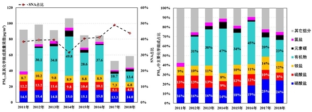北京2011-2018年秋冬季PM2.5化學組分濃度及占比年際變化