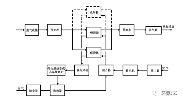 圖3:熱氣流(空氣)再生—催化燃燒或高溫焚燒工藝流程