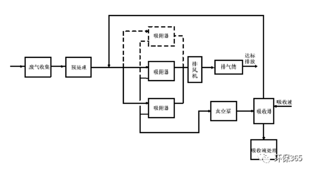當廢氣中的有機物具有回收價值時,可根據(jù)情況選擇采用水蒸氣再生、熱氣流(空氣或惰性氣體)再生或降壓解吸再生工藝。脫附后產(chǎn)生的高濃度氣體可根據(jù)情況選擇采用降溫冷凝或液體吸收工藝對有機物進行回收。