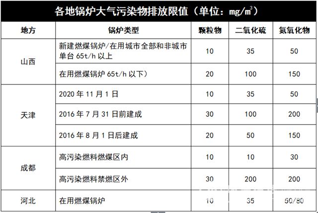 為盡快實現(xiàn)空氣污染治理目標,各地在鍋爐大氣污染治理上嚴格遵守“因地制宜”原則,很多地方的標準遠遠嚴于國家的鍋爐大氣污染物排放標準和要求。就拿燃煤鍋爐看來,具體如下: