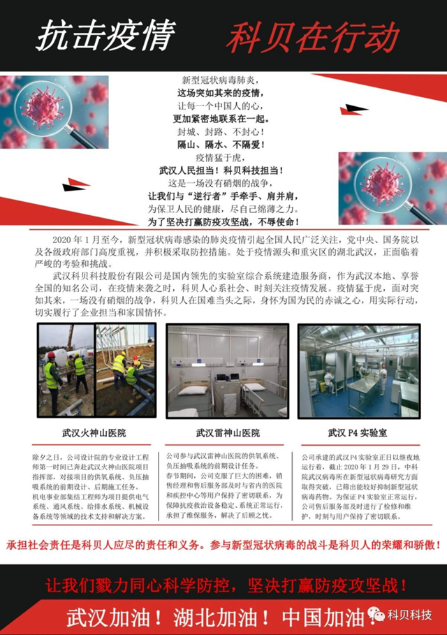 武漢科貝科技股份有限公司是國(guó)內(nèi)的實(shí)驗(yàn)室綜合系統(tǒng)建造服務(wù)商。作為武漢本地、享譽(yù)全國(guó)的科貝科技,在疫情來(lái)襲之時(shí),心系社會(huì),臨危受命,緊急承接了馳援火神山醫(yī)院建設(shè)的部分任務(wù)??曝惾嗽趪?guó)難之際,展現(xiàn)了身懷為國(guó)為民的赤誠(chéng)之心,用實(shí)際行動(dòng),切實(shí)履行了企業(yè)擔(dān)當(dāng),充分彰顯了科貝人深情大愛(ài)的家國(guó)情懷!