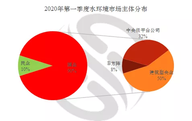 在水環(huán)境市場民企所獲得的市場份額只占一成,近九成的市場份額被國企拿到。國企所占的份額中,建筑型央企占50%,中央級平臺公司占比32%,B方陣占比8%。