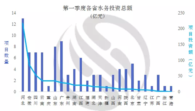 從全國范圍來看,第一季度全國有23個省市涉及水務(wù)投資運營項目。其中河北省投資額已超200億元,僅唐山市全域治水清水潤城縣區(qū)工程PPP項目投資額就已達(dá)到118.08億元,是迄今為止唐山市實施的最大的PPP項目。安徽省投資額86億元,四川省投資額53億元,分列二、三位。