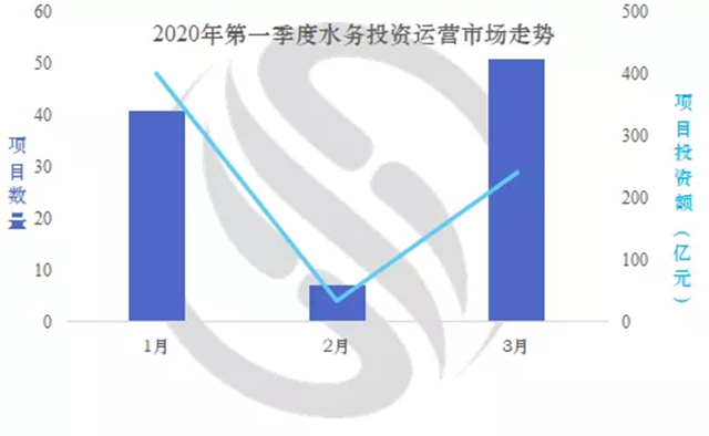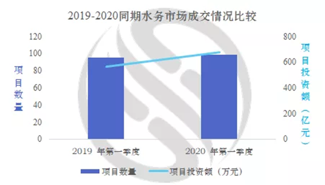 一季度水務(wù)市場走勢:2月受疫情影響觸底,3月反彈。項目成交數(shù)量與去年同期相比基本持平,成交投資額甚至有所增加,增加了20%。(4)