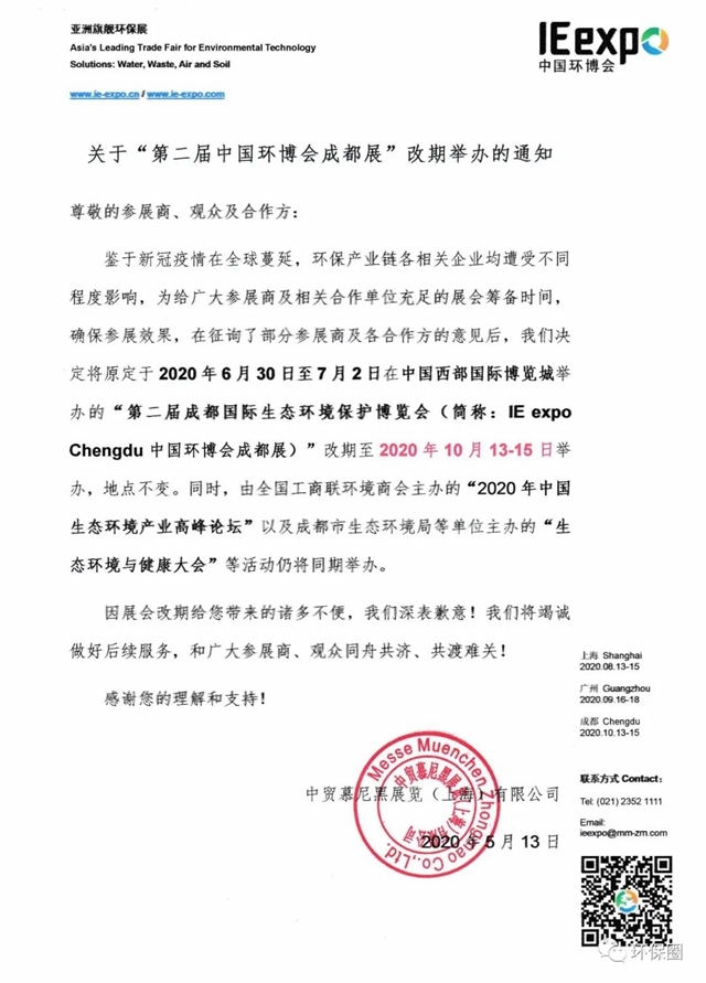 原定于2020年6月30日至7月2日在中國西部國際博覽城舉辦的“第二屆中國環(huán)博會成都展IE expo Chengdu”改期至2020年10月13-15日,舉辦地點(diǎn)不變。同時,