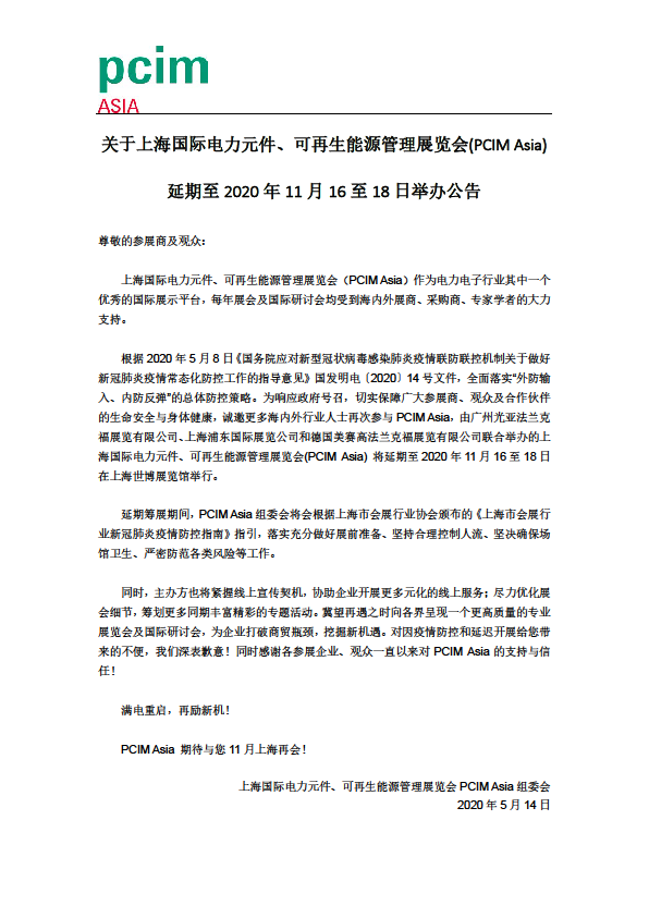 日前,PCIM Asia的主辦方宣布原定于7月初舉辦的PCIM Asia - 上海國際電力元件、可再生能源管理展覽會將延期至2020年11月16至18日于上海世博展覽館舉行。