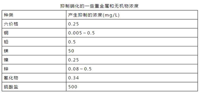 某些重金屬離子、絡(luò)合陰離子、氰化物以及一些有機物質(zhì)會干擾或破壞硝化細(xì)菌的正常生理活動。當(dāng)這些物質(zhì)在污水中的濃度較高,便會抑制生物硝化的正常運行。例如,當(dāng)鉛離子大于0.5mg/L、酚大于5.6mg/L、硫脲大于0.076mg/L時,硝化均會受到抑制。有趣的是,當(dāng)NH3-N濃度大于200mg/L時,也會對硝化過程產(chǎn)生抑制,但城市污水中一般不會有如此高的NH3-N濃度。