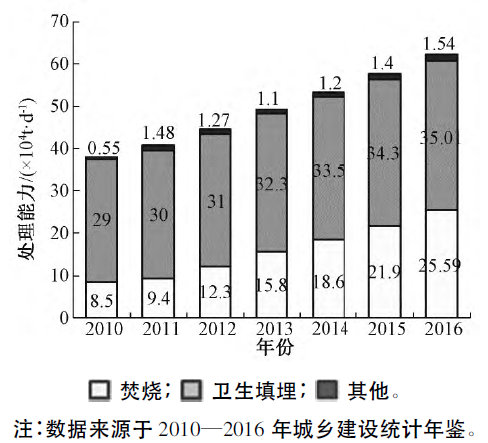 圖1 2010—2016中國(guó)生活垃圾處理能力由圖1可知:我國(guó)生活垃圾主要處理方式為填埋與焚燒,其中填埋仍占主要地位。填埋處理具有方法簡(jiǎn)單、技術(shù)門檻低的特點(diǎn),是我國(guó)長(zhǎng)期以來(lái)廣泛采用的處理方式,但填埋場(chǎng)占地大、使用年限短,不但可能影響地下水和土壤環(huán)境,還會(huì)造成大量有機(jī)質(zhì)的浪費(fèi),與可持續(xù)發(fā)展、綠色發(fā)展的理念相悖。與填埋不同,焚燒處理占地小、能極大程度地實(shí)現(xiàn)減量化,并產(chǎn)生電能,近年來(lái)發(fā)展迅猛。此外,其他處理方式(如堆肥等)處理能力也大幅提升。就發(fā)展趨勢(shì)來(lái)看,多元化方式或?qū)⒅鸩饺〈盥癯蔀橹鲗?dǎo)的處理模式。
