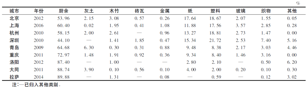 2016年,《生活垃圾分類制度實(shí)施方案》要求在省會(huì)城市、直轄市、5個(gè)計(jì)劃單列市以及第1批生活垃圾分類示范城市等46個(gè)城市先行實(shí)施生活垃圾強(qiáng)制分類工作;同年6月,住建部公布第一批100個(gè)農(nóng)村生活垃圾分類和資源化利用示范縣(市、區(qū))。根據(jù)調(diào)研和文獻(xiàn)可知典型示范城市生活垃圾組分,如表3所示。各示范城市普遍采用 “大類粗分,干濕分離”的原則,主要措施為建設(shè)規(guī)范化垃圾資源回收體系。對(duì)垃圾分類示范城市的調(diào)研發(fā)現(xiàn),南京、石家莊、蘭州等示范城市已采用積分兌換等措施,大幅提高了垃圾分類的參與度;部分示范城市已根據(jù)垃圾收集情況建設(shè)了分類處理設(shè)施;此外,如青島、蘇州等摸索建立了聯(lián)席會(huì)議、垃圾分類實(shí)施方案等相關(guān)制度和法規(guī)。