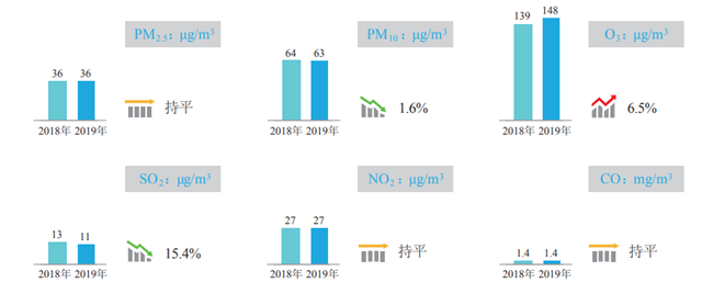 PM2.5、PM10、O3、SO2、NO2和CO濃度分別為36微克/立方米、63微克/立方米、148微克/立方米、11微克/立方米、27微克/立方米和1.4毫克/立方米;與2018年相比,PM10和SO2濃度下降,O3濃度上升,其他污染物濃度持平。