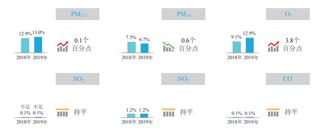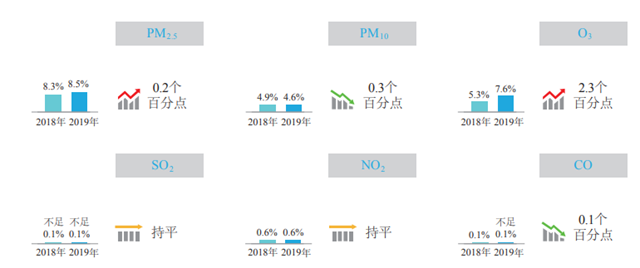 PM2.5、PM10、O3、SO2、NO2和CO超標(biāo)天數(shù)比例分別為8.5%、4.6%、7.6%、不足0.1%、0.6%和不足0.1%;與2018年相比,PM10和CO超標(biāo)天數(shù)比例下降,SO2和NO2超標(biāo)天數(shù)比例持平,PM2.5和O3超標(biāo)天數(shù)比例上升。