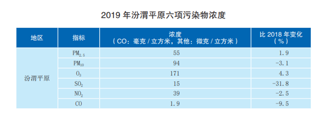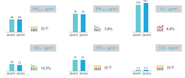PM2.5、PM10、O3、SO2、NO2和CO濃度分別為44微克/立方米、74微克/立方米、167微克/立方米、12微克/立方米、33微克/立方米和1.5毫克/立方米;與2018年相比,PM10和SO2濃度下降,O3濃度上升,其他污染物濃度持平。