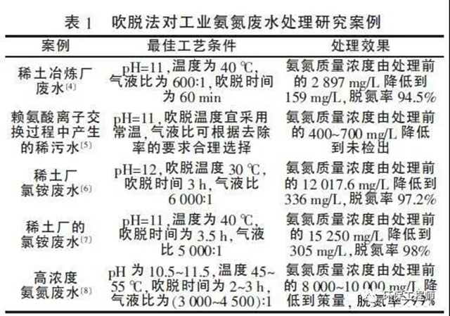 通過對(duì)比分析表1 可以得出:(1)吹脫法普遍適宜的pH 在11 附近;(2)考慮經(jīng)濟(jì)因素,溫度在30~40 ℃附近較為可行,且處理率高;(3)吹脫時(shí)間為3 h左右;(4)氣液比在5 000∶1 左右效果較好,且吹脫溫度越高,氣液比越??;(5)吹脫后廢水的濃度可降低到中低濃度;(6)脫氮率基本保持90%以上。盡管吹脫法可以將大部分氨氮脫除, 但處理后的廢水中氨氮仍然高達(dá)100 mg/L 以上,無法直接排放,還需要后續(xù)深度處理