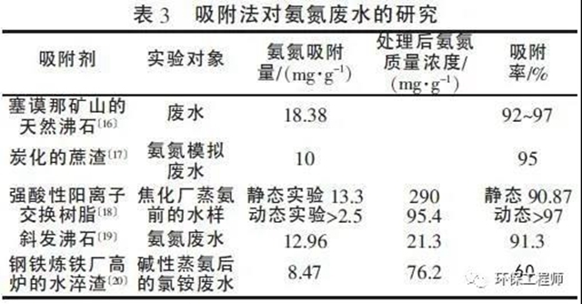 該法一般只適用于低濃度氨氮廢水, 而對(duì)于高濃度的氨氮廢水, 使用吸附法會(huì)因吸附劑更換頻繁而造成操作困難, 因此需要結(jié)合其他工藝來協(xié)同完成脫氮過程。供吸附法使用的吸附劑很多, 但不同吸附劑對(duì)廢水中氨氮的吸附量卻有很大不同, 表3 對(duì)比了部分吸附劑的吸附效果。