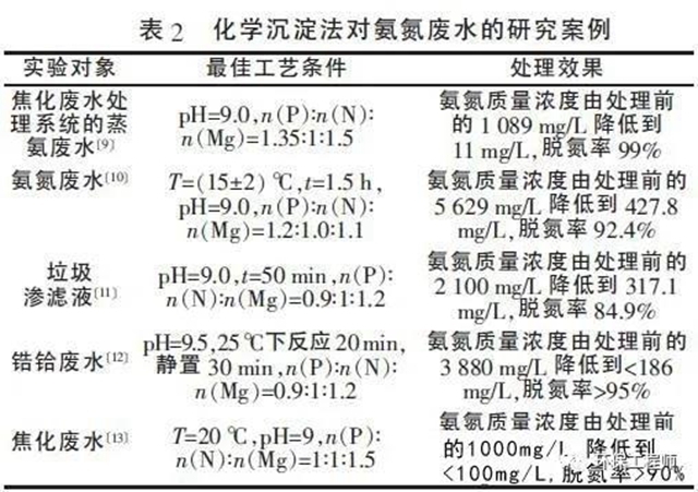 化學(xué)沉淀法的優(yōu)點(diǎn)主要表現(xiàn)在:工藝設(shè)計(jì)操作相對(duì)簡單;反應(yīng)穩(wěn)定,受外界環(huán)境影響小,抗沖擊能力強(qiáng);脫氮率高,效果明顯,生成的磷酸銨鎂可作為無機(jī)復(fù)合肥使用,解決了氮的回收和二次污染的問題,具有良好的經(jīng)濟(jì)和環(huán)境效益。磷酸銨鎂沉淀法適用于處理氨氮濃度較高的工業(yè)廢水, 表2 總結(jié)了一些使用化學(xué)沉淀法處理氨氮廢水的案例。