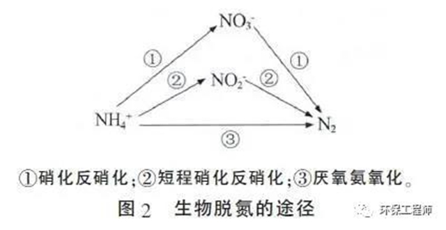 生物法是指廢水中的氨氮在各種微生物作用下,通過硝化、反硝化等一系列反應(yīng)最終生成氮?dú)?,從而達(dá)到去除的目的,其脫氮途徑如圖2 所示。對(duì)于可生化性高的廢水(BOD/COD>0.3),氨氮可通過生物法脫除。