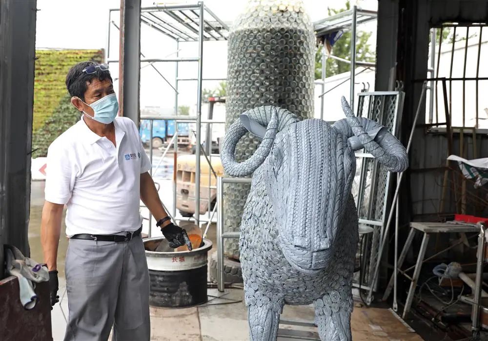 閔行區(qū)浦錦街道的兩網(wǎng)融合中轉(zhuǎn)服務(wù)站里,輪胎、金屬構(gòu)件等可回收物被制作成各種頗具觀賞價值的“公共家具”,放置在口袋公園、小區(qū)花園里 李茂君 攝
