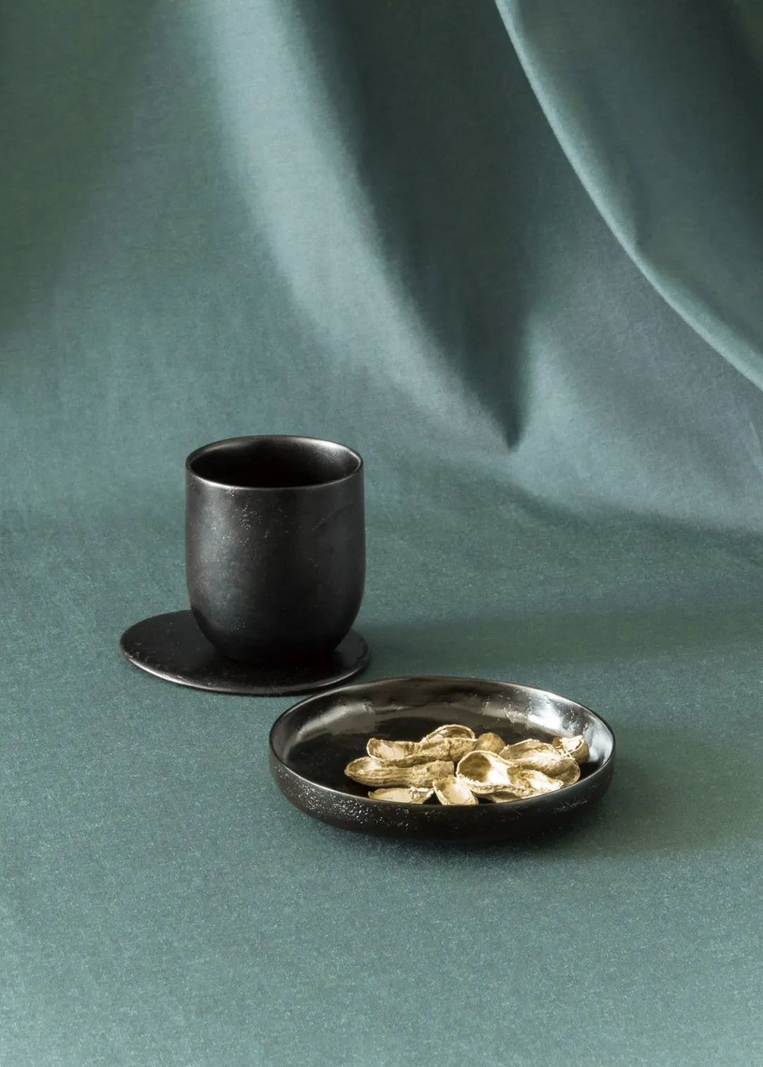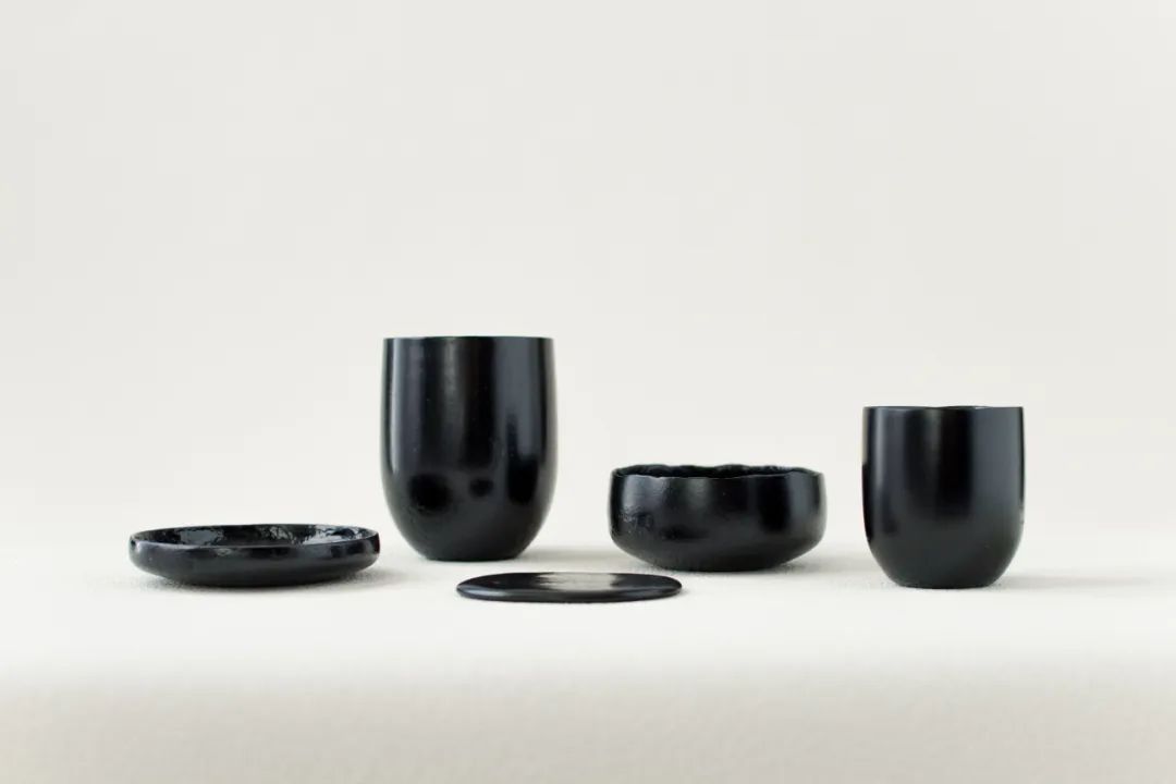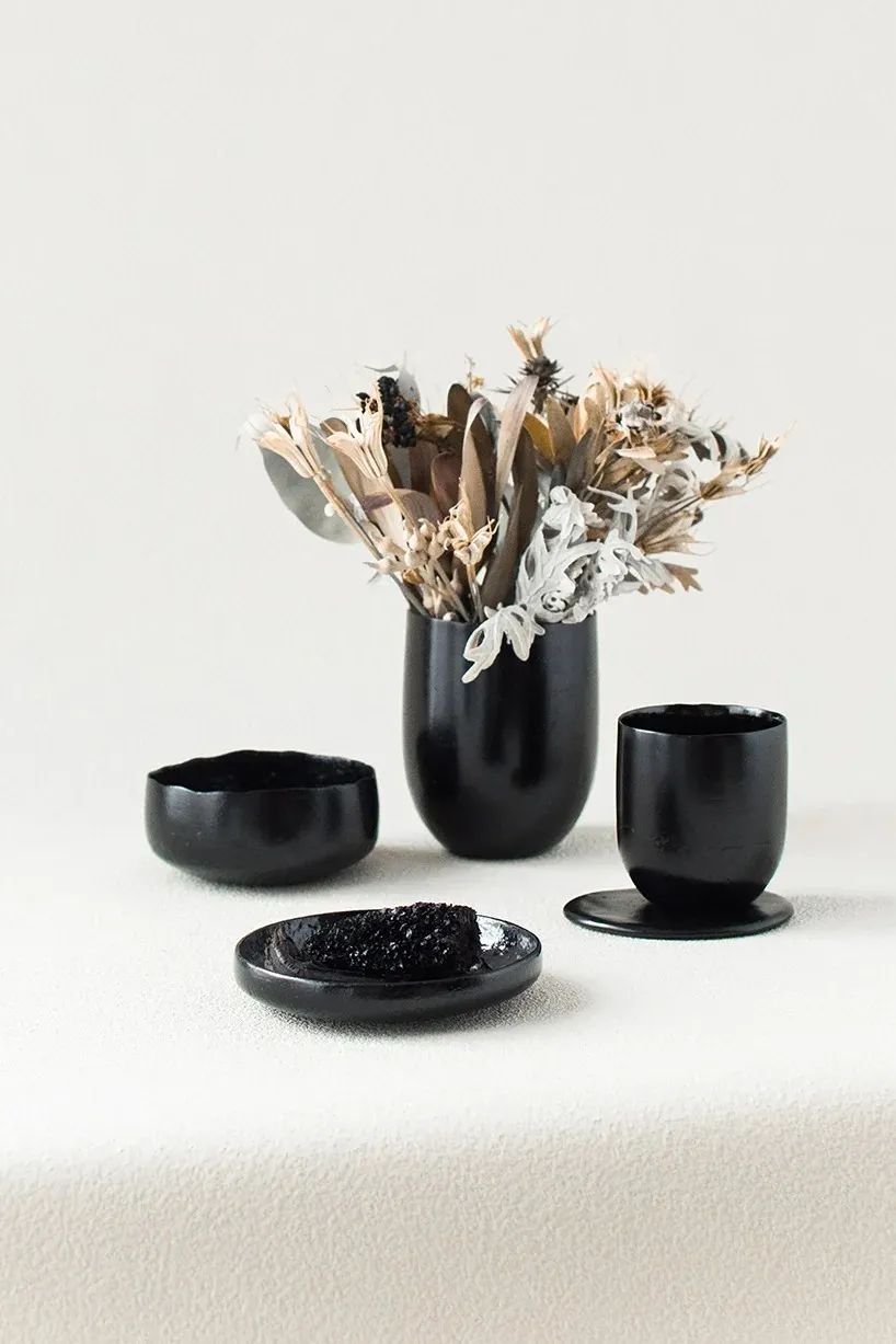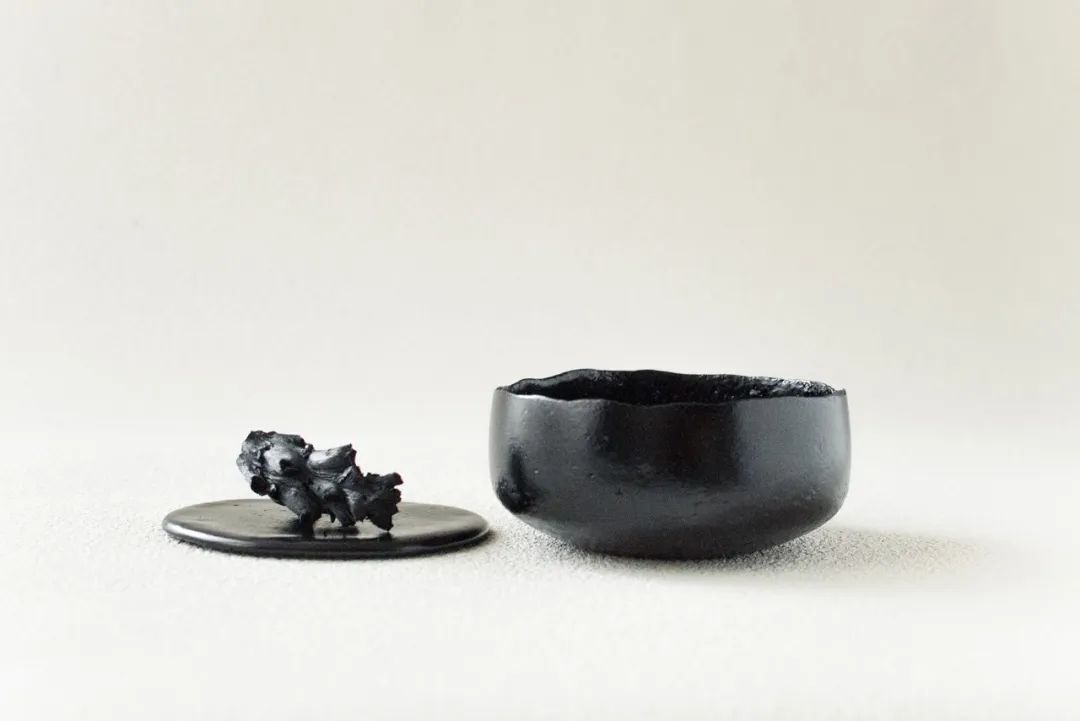 器皿的黑色本體,來自食物碳化后的本真色彩,這背后也別有一番深意。Araki篤信萬物有靈,把食物碳化的過程,仿佛是為那些被拋棄的生命舉行一場(chǎng)莊嚴(yán)儀式。垃圾焚化后,轉(zhuǎn)世成為美麗的造物,也是這個(gè)系列名字“Anima”(靈魂)的來源。