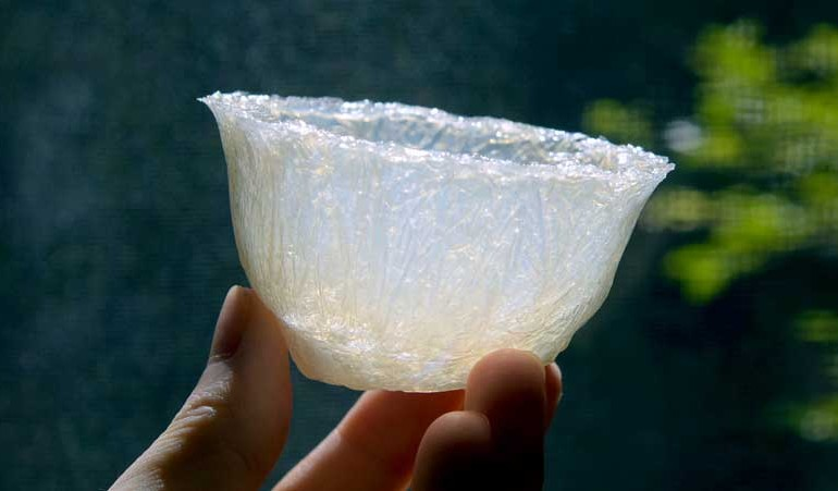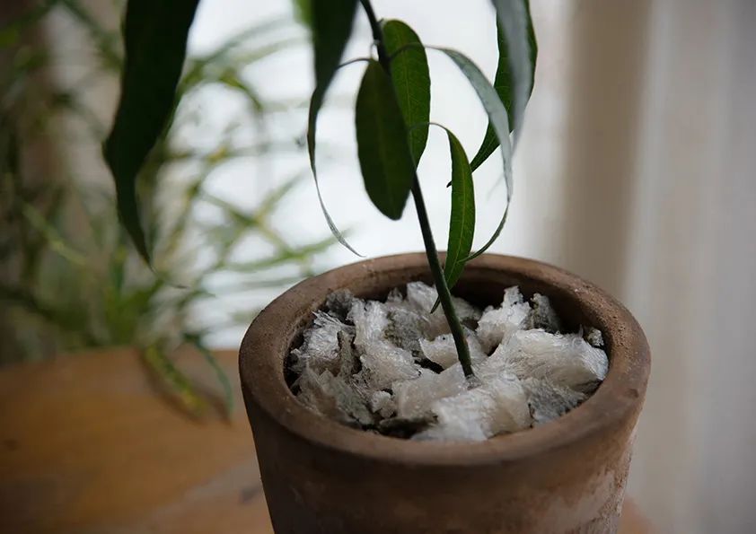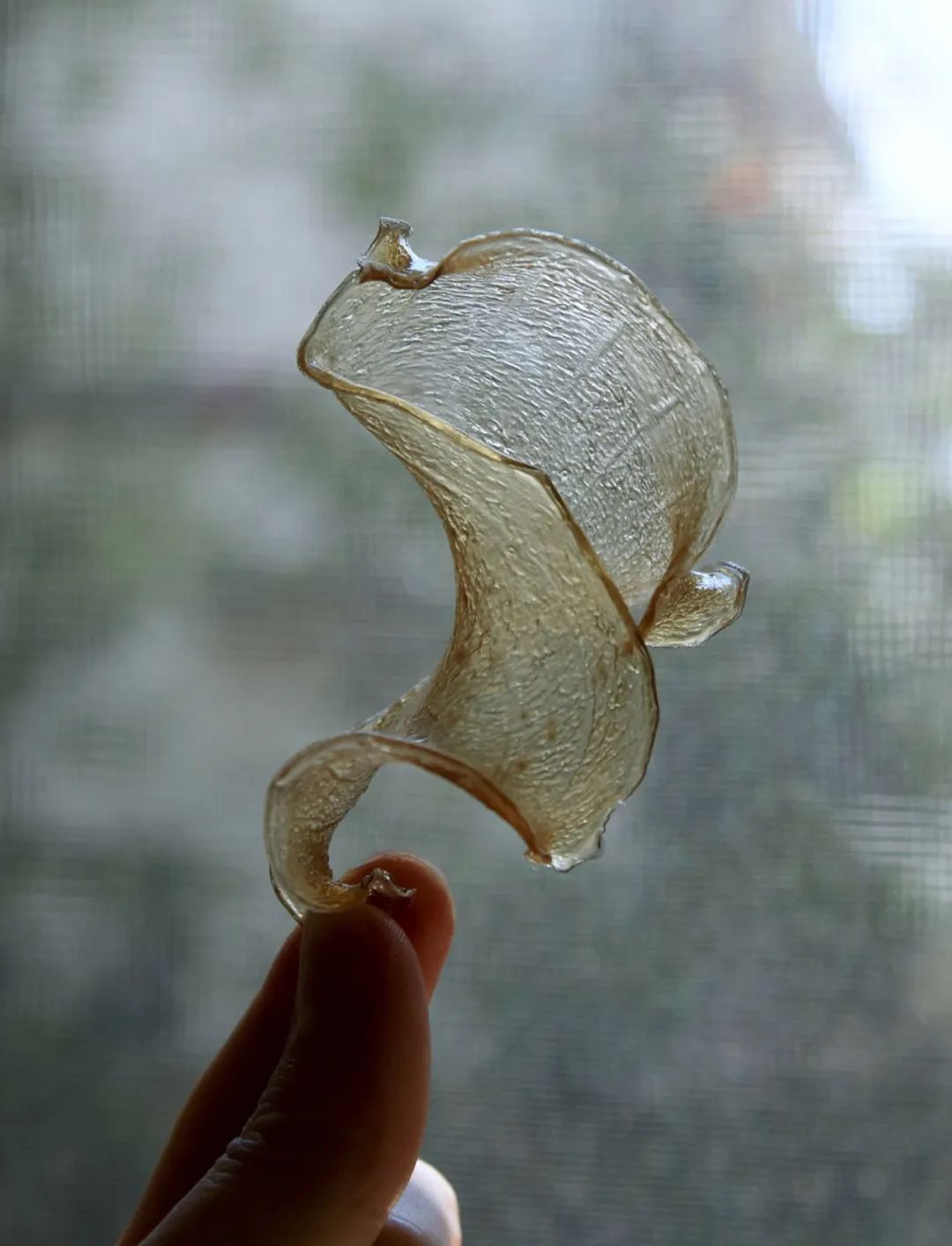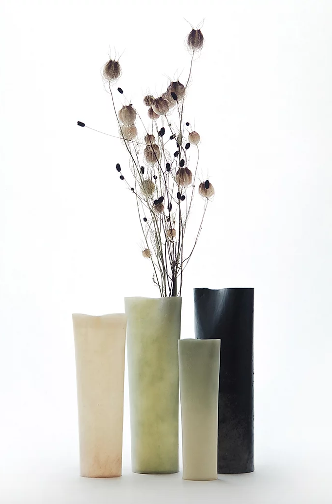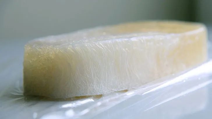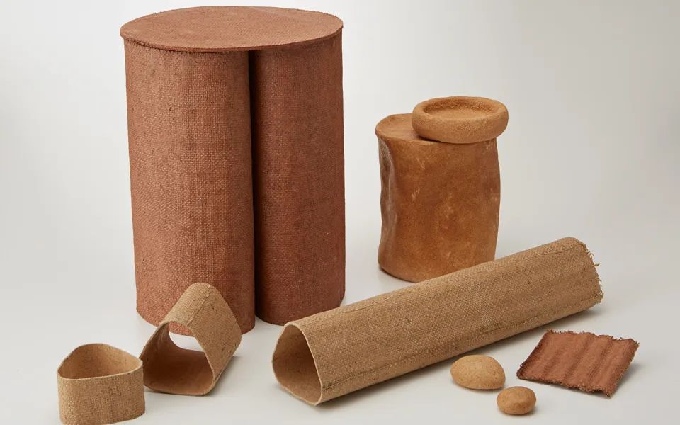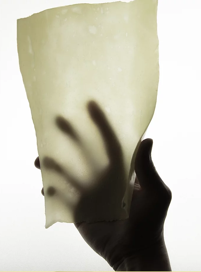 那要用什么替代塑料呢?他們發(fā)現(xiàn)了制作和菓子的主料,瓊脂,就是一個(gè)很適合的替代品。瓊脂的質(zhì)地透明多變,薄厚軟硬可以輕松調(diào)節(jié),還能夠自然降解,是一個(gè)可塑性強(qiáng)、潛力無限的材質(zhì)。瓊脂做的包裹填充物,比泡泡紙更輕盈也更有彈性,它成功保護(hù)著Araki的快遞從日本安全抵達(dá)意大利,此等優(yōu)越發(fā)明讓Araki獲得了2016年Lexus全球設(shè)計(jì)大獎(jiǎng)。此外,Araki還試著用天然的松樹脂和植物蠟,代替常見的亞克力材料。他設(shè)計(jì)的植脂花瓶,柔韌且防水,又比塑料更多了一份氤氳。植物材料天生有記憶屬性,在不同的溫度控制下,很容易用手工塑形,讓這些花器有了流水線產(chǎn)品缺少的溫度。而作為大米消費(fèi)大國,日本每年都有成噸的大米囤積發(fā)霉變質(zhì)。Araki借鑒日本歷史上,用大米制成膠水穩(wěn)固房屋的案例,他用大米膠水粘合木屑和黃麻,制成強(qiáng)韌的圓柱體。