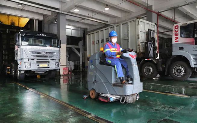 工作人員駕駛清潔車在上海城投環(huán)境集團(tuán)徐浦基地裝運(yùn)車間內(nèi)工作(6月22日攝)。新華社記者 方喆 攝