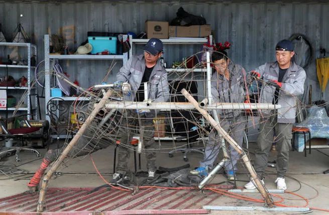 上海閔行區(qū)浦錦街道的“兩網(wǎng)融合”中轉(zhuǎn)服務(wù)站成立了一個利用廢棄物制作藝術(shù)品的團(tuán)隊。這是團(tuán)隊成員郭宇(左)、劉景強(qiáng)(中)和李剛在中轉(zhuǎn)服務(wù)站工棚內(nèi)工作(5月27日攝)。新華社記者 方喆 攝