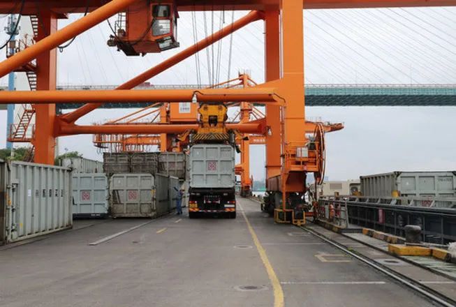 在上海城投環(huán)境集團(tuán)徐浦基地內(nèi)的碼頭上,龍門吊將卡車上的垃圾裝運(yùn)集裝箱裝船(6月22日攝)。新華社記者 方喆 攝