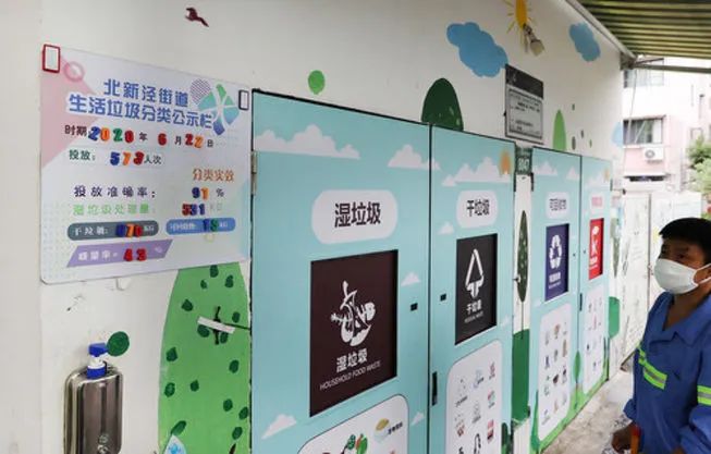 在上海長寧區(qū)新涇六村小區(qū)垃圾分類投放點(diǎn),公示欄上顯示前一天的垃圾分類情況數(shù)據(jù)(6月23日攝)。新華社記者 方喆 攝