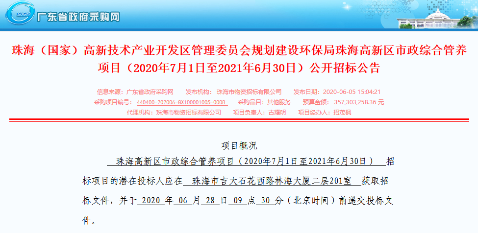 按照開標(biāo)計劃,6月28日,采購預(yù)算高達357,303,258.36元/年的珠海高新區(qū)市政綜合管養(yǎng)項目將公布中標(biāo)結(jié)果。