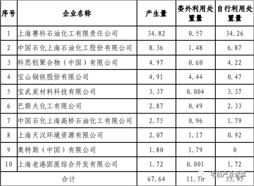上海市危險廢物產(chǎn)生量前10位的企業(yè),其產(chǎn)生量合計67.64萬噸,占比上海市危險廢物產(chǎn)生總量的46.92%。