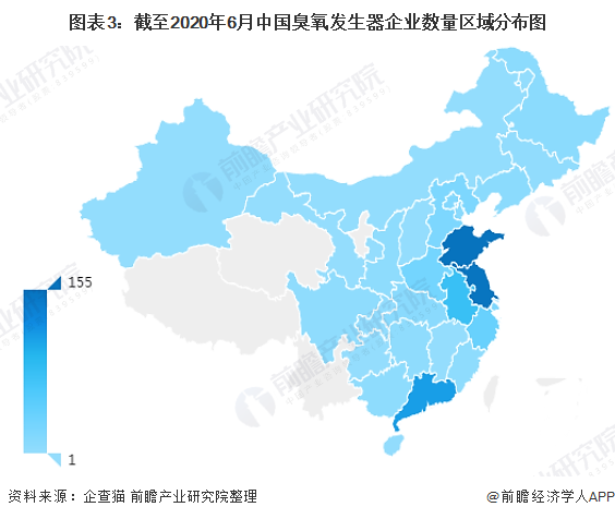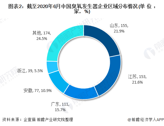 截至2020年6月,通過企查貓查詢得出的709家企業(yè)中,大部分企業(yè)分布在山東、江蘇和廣東地區(qū),三個(gè)省份企業(yè)數(shù)量占全國(guó)的59.1%。前五省份企業(yè)數(shù)量占全國(guó)的75.5%。整體來看,臭氧發(fā)生器行業(yè)區(qū)域市場(chǎng)集中度較高。