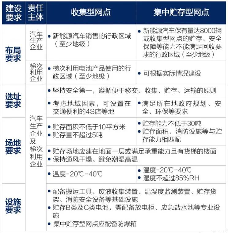 電池回收網點分為收集型網點和集中貯存型網點。這兩類網點分工也不難理解,收集型網點是收集、暫存廢舊動力電池的場地,主要用于存放從車主手中回收到的動力電池;集中貯存型網點,則是大批量儲存報廢車輛或者廢舊動力電池的場地,用于中轉、集中儲運回收上來的動力電池。