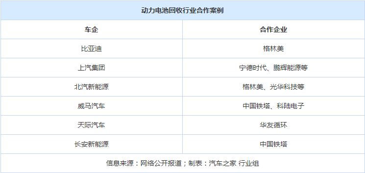 羅蘭貝格管理咨詢公司執(zhí)行總監(jiān)吳釗看來,具備客戶和渠道基礎是解決動力電池回收問題的核心,考慮到電池回收的運營體系復雜性,目前市場上主流做法為“抱團合作”,即車企、電池企業(yè)及回收企業(yè)達成戰(zhàn)略合作,利用各自的優(yōu)勢,解決動力電池回收難題。