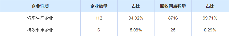 汽車之家統計出工信部公布的動力電池回收網點情況,截至2020年5月,全國共有回收服務網點8741個,其中涉及整車企業(yè)112家,梯次利用企業(yè)6家。從網點分布情況來看,車企建立的回收網點占據絕大部分數量,在全國各地均有覆蓋。從具體網點來看,以汽車企業(yè)4S店網絡為主,也有少部分與車企合作的報廢拆解企業(yè)建立的網點,以及梯次利用企業(yè)建立的網點。