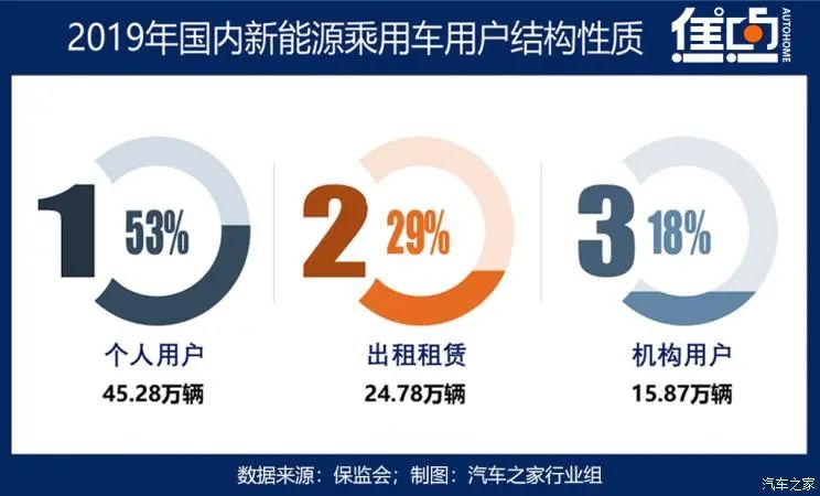 再看新能源乘用車都賣給了誰?以2019年數據為例,汽車之家了解到,個體用戶、出租租賃、機構用戶是新能源乘用車采購的三大“金主”。