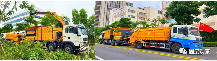 圖為遭受臺風(fēng)后移動式破碎車就地處理園林垃圾