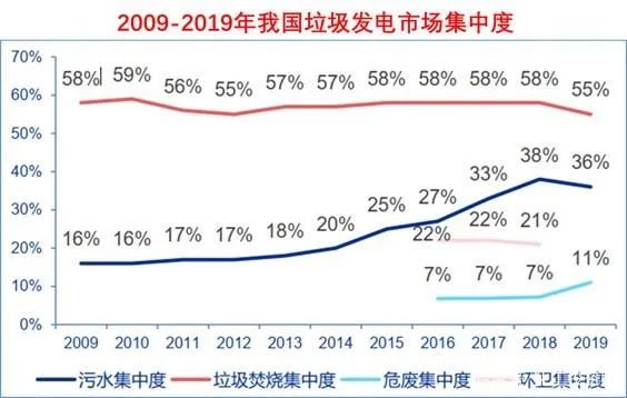 垃圾發(fā)電市場集中度基本在55-60%,當(dāng)前頭部集中趨勢明顯:資金實力強、融資成本低、運營/成本控制能力強的企業(yè)逐漸擴大了市場影響力,做大做強;加上國家環(huán)保趨勢、補貼新政和市場下沉,使得龍頭企業(yè)競爭更加集中;