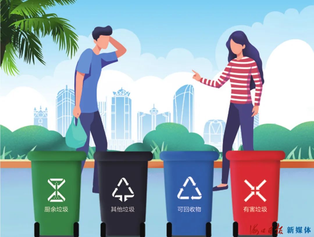 海口市生活垃圾分類(lèi)實(shí)行“可回收物、有害垃圾、廚余垃圾(含餐廚廢棄物、果蔬垃圾等)和其他垃圾”四分類(lèi)標(biāo)準(zhǔn)。