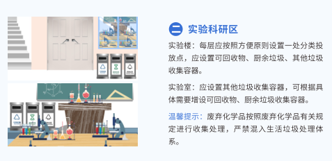 學(xué)校場(chǎng)景的指引按師生的日常活動(dòng),分區(qū)進(jìn)行指導(dǎo),貼合師生生活實(shí)際。其中對(duì)實(shí)驗(yàn)科研區(qū)可能會(huì)產(chǎn)生廢棄化學(xué)品,指引中做出了相關(guān)溫馨提示,“廢棄化學(xué)品按照廢棄化學(xué)品有關(guān)規(guī)定進(jìn)行收集處理,嚴(yán)禁混入生活垃圾處理體系”。