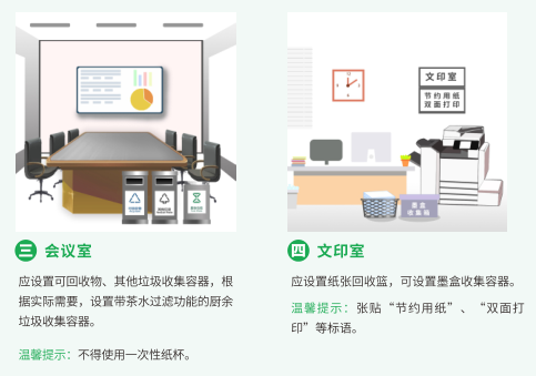 機(jī)關(guān)企事業(yè)單位、工業(yè)園區(qū)、商務(wù)寫字樓要發(fā)揮生活垃圾源頭減量示范作用,三份指引里明確提倡綠色辦公,優(yōu)先采購(gòu)可循環(huán)利用的產(chǎn)品,減少使用一次性辦公用品,推廣無紙化辦公,紙張盡量雙面書寫或雙面打印。另外會(huì)議室貼合實(shí)際設(shè)置帶茶水過濾功能的廚余垃圾收集容器,著重提示不得使用一次性紙杯。