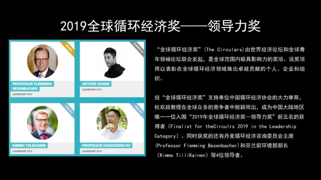 從我們國家來講,全國200多個大中城市,每年會產(chǎn)生2億多噸的垃圾,這個量非常大,如果中國的垃圾分類工作做好了,全世界的循環(huán)經(jīng)濟的工作就做好了三分之一,所以達沃斯世界經(jīng)濟論壇設(shè)立了一個全球循環(huán)經(jīng)濟獎,專門獎勵這方面的企業(yè)和領(lǐng)導(dǎo)人、專家,很榮幸在2019年,我作為中國大陸唯一的一個人入圍了它的領(lǐng)導(dǎo)力獎。