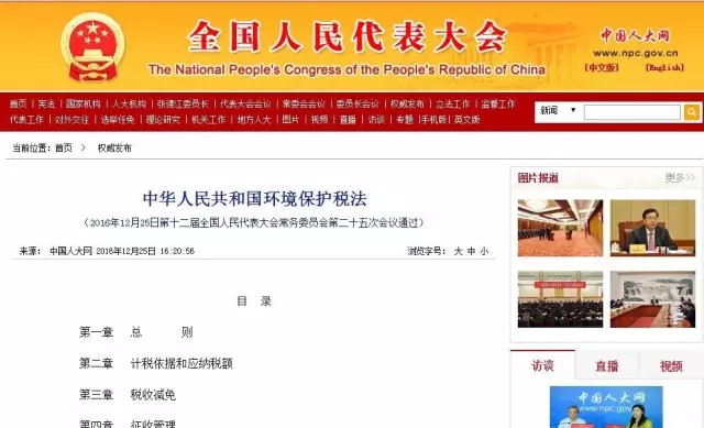 2016年12月25日,曾走過(guò)6年立法之路、歷經(jīng)兩次審議的《中華人民共和國(guó)環(huán)境保護(hù)稅法》終于由第十二屆全國(guó)人民代表大會(huì)常務(wù)委員會(huì)第二十五次會(huì)議通過(guò)。習(xí)近平簽發(fā)中華人民共和國(guó)第六十一號(hào)主席令予以公布,新法自2018年1月1日起施行。