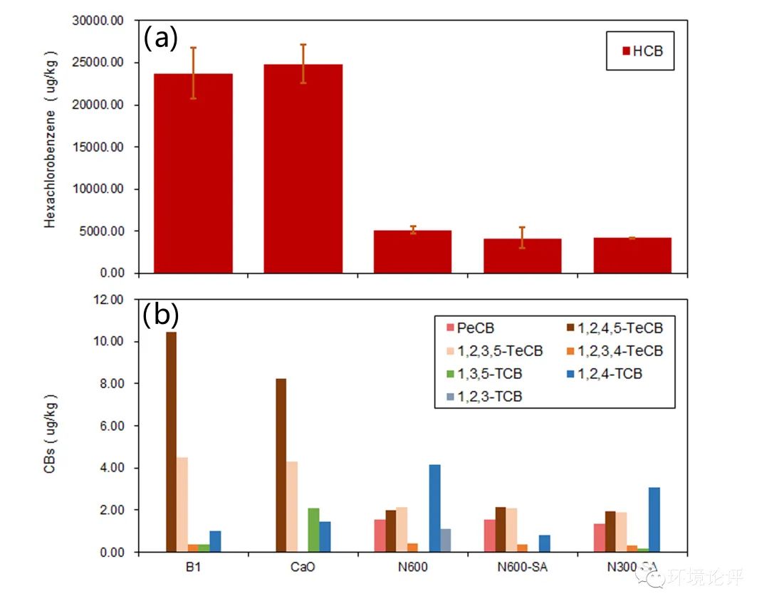 對實(shí)驗(yàn)組的六氯苯及其他氯苯的總量進(jìn)行測試分析,結(jié)果如圖5所示,可見n-Al/CaO對于氯代有機(jī)物的去除有較為顯著的效果。相比于未經(jīng)處理的飛灰樣品和使用CaO進(jìn)行處理的對照組,實(shí)驗(yàn)組的六氯苯及氯苯類物質(zhì)總量均有顯著的下降,在最佳實(shí)驗(yàn)組N600SA中超過82.43%的六氯苯被降解去除。
