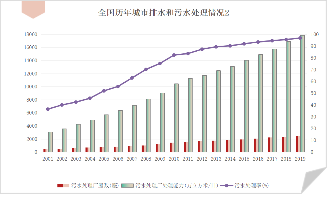 上圖也可以看出,我國(guó)城市污水處理能力隨著污水處理廠的增多顯著上升,污水處理率也是節(jié)節(jié)攀升。