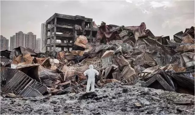 這個是在福島目前生活的唯一的日本人——中村先生,他是全世界輻射量最高的人之一??赡鼙炔涣饲袪栔Z貝利,但他是日本最高的。我為了取得他的信任,跟他住了兩天,通過手機免提翻譯來采訪他。他非常信任我,他告訴我說你在我這沒有問題,但如果你被核輻射以后的所有后果我不承擔責(zé)任。這個老人現(xiàn)在一直在日本這個地方照顧動物,我看到他跟動物在一起的時候,我覺得他跟動物那種情感、那種自然是無與倫比的。當然作為記者,我們有很多不能言說的東西,有很多報道的禁區(qū),我們是怎么去應(yīng)對的呢?天津大爆炸這張照片大家可能知道,(獲得了)今年的荷賽獎,包括一些國內(nèi)的大獎。這是我第三天去拍的一張照片。