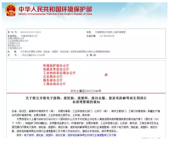 為貫徹落實(shí)《土壤污染防治行動(dòng)計(jì)劃》《國(guó)務(wù)院辦公廳關(guān)于印發(fā)禁止洋垃圾入境推進(jìn)固體廢物管理制度改革實(shí)施方案》(國(guó)辦發(fā)〔2017〕70號(hào)),環(huán)境保護(hù)部聯(lián)合發(fā)展改革委、工業(yè)和信息化部、公安部、商務(wù)部、工商總局開展電子廢物、廢輪胎、廢塑料、廢舊衣服、廢家電拆解等再生利用行業(yè)清理整頓。