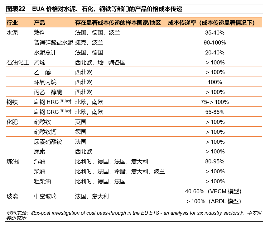 對商品市場而言,碳交易價(jià)格與相關(guān)產(chǎn)品價(jià)格同向波動,EUA價(jià)格作為成本可能傳遞至電力、鋼鐵、水泥、煉油等行業(yè),引發(fā)產(chǎn)品價(jià)格相應(yīng)上升。