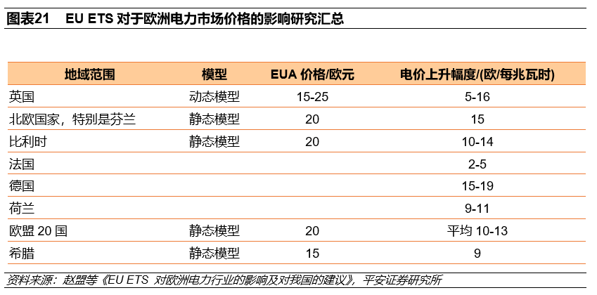 影響電價(jià)的主要因素包括燃料價(jià)格、環(huán)境政策及氣候等,EU ETS使得碳排放配額價(jià)格成為為發(fā)電企業(yè)的機(jī)會成本,從而有可能提高電力市場價(jià)格。趙盟等(2012)在《EU ETS對歐洲電力行業(yè)的影響及對我國的建議》中總結(jié)了EU ETS對歐洲電力市場影響的相關(guān)研究,發(fā)現(xiàn)多數(shù)研究結(jié)果表明EU ETS提高了電力市場價(jià)格,不同水平的電力價(jià)格提升則可能與地域能源結(jié)構(gòu)、EUA價(jià)格(期貨價(jià)格)對電力企業(yè)的生產(chǎn)成本影響等有關(guān)。